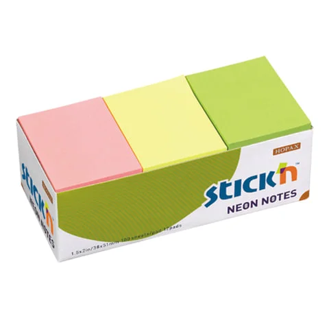 Блок для записей с клейким краем Stick'n 3 цвета, неон, 38x51мм, 12х100 листов