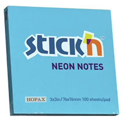 Блок для записей с клейким краем Stick'n голубой, неон, 76х76мм, 100 листов