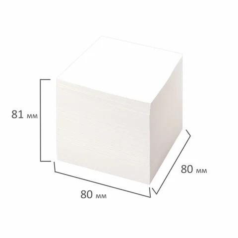 Блок высотой 9 см сложен из квадратных листов размером 9х9 см. Листы изготовлены из высококачественной офсетной бумаги плотностью 60 г/м2 и белизной 90-92%. Блок для записей подходит для письма любыми типами ручек и карандашей.