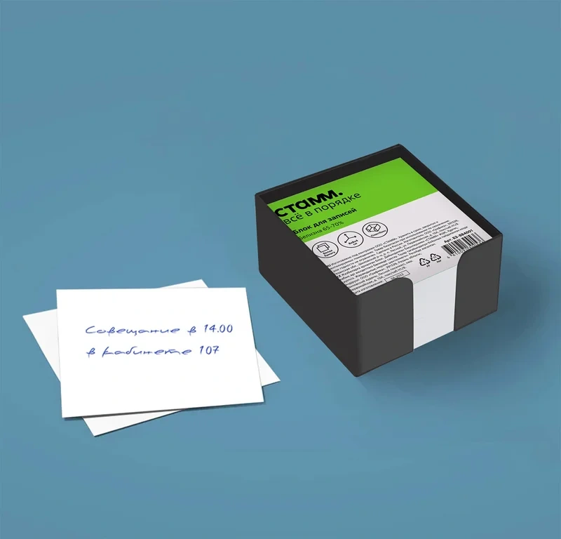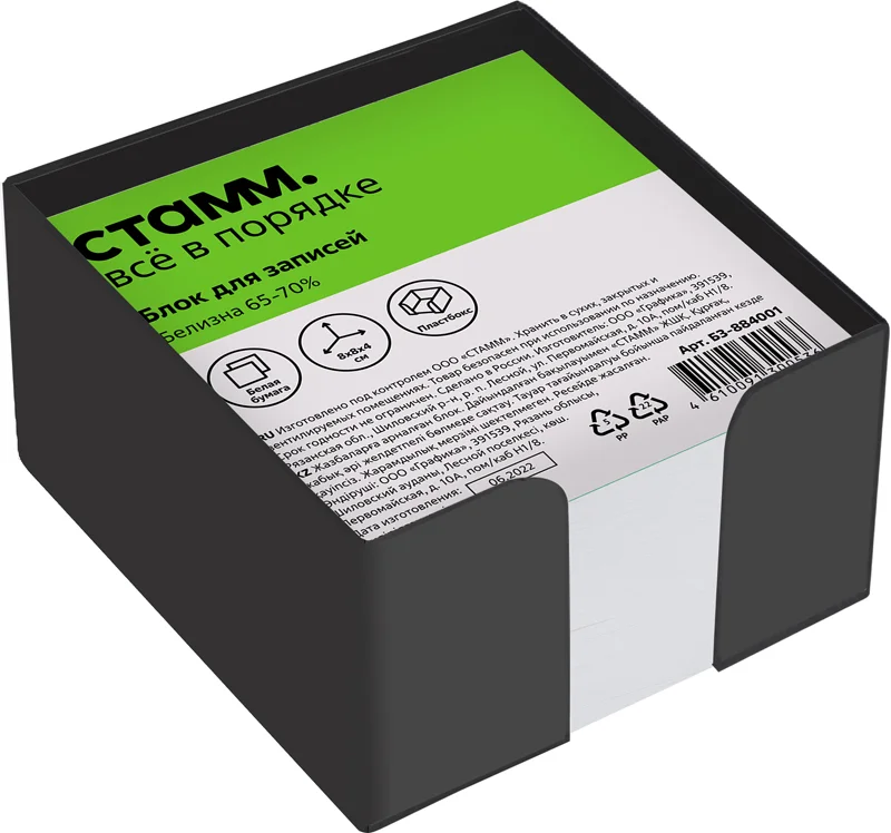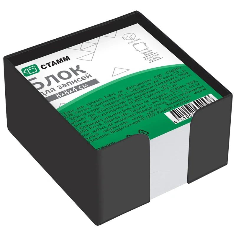 Блок бумаги «СТАММ» Стандарт в чёрном пластиковом боксе подходит для оперативных записей необходимой информации. Размер листа в блоке - 80*80 мм, высота блока - 40 мм. Цвет бумаги блока - белый со стандартом белизны 65-70%. Блок бумаги для записей и заметок представлен в индивидуальной упаковке в термоусадочной пленке.