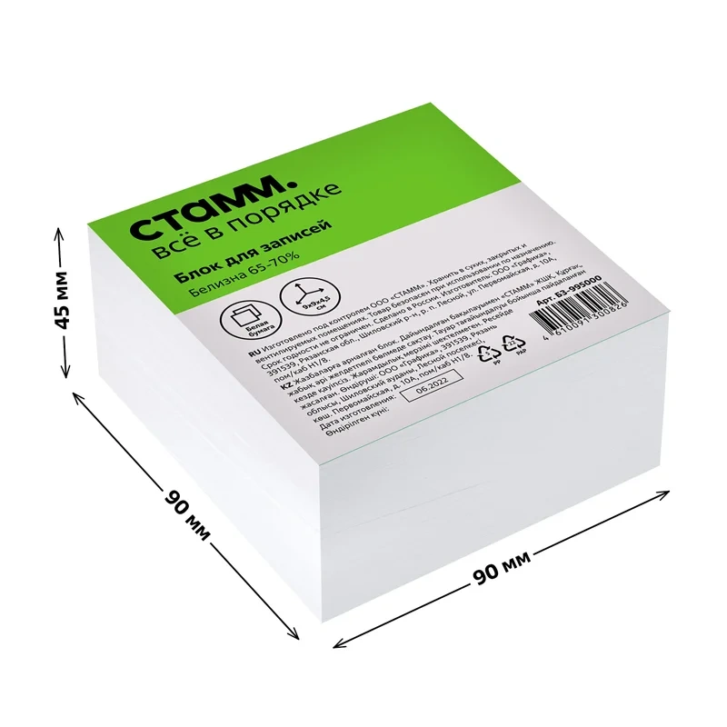 Блок бумаги «СТАММ» подходит для оперативных записей необходимой информации. Размер листа в блоке: 90*90 мм, высота блока – 45 мм. Цвет бумаги блока - белый со стандартом белизны 65-70%. Может использоваться в пластиковых подставках и настольных органайзерах. Блок для записей представлен в индивидуальной упаковке в термоусадочной плёнке.