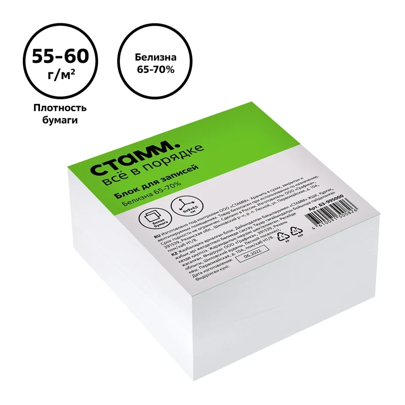 Блок для записей СТАММ, 9*9*4,5см, белый, белизна 65-70%
