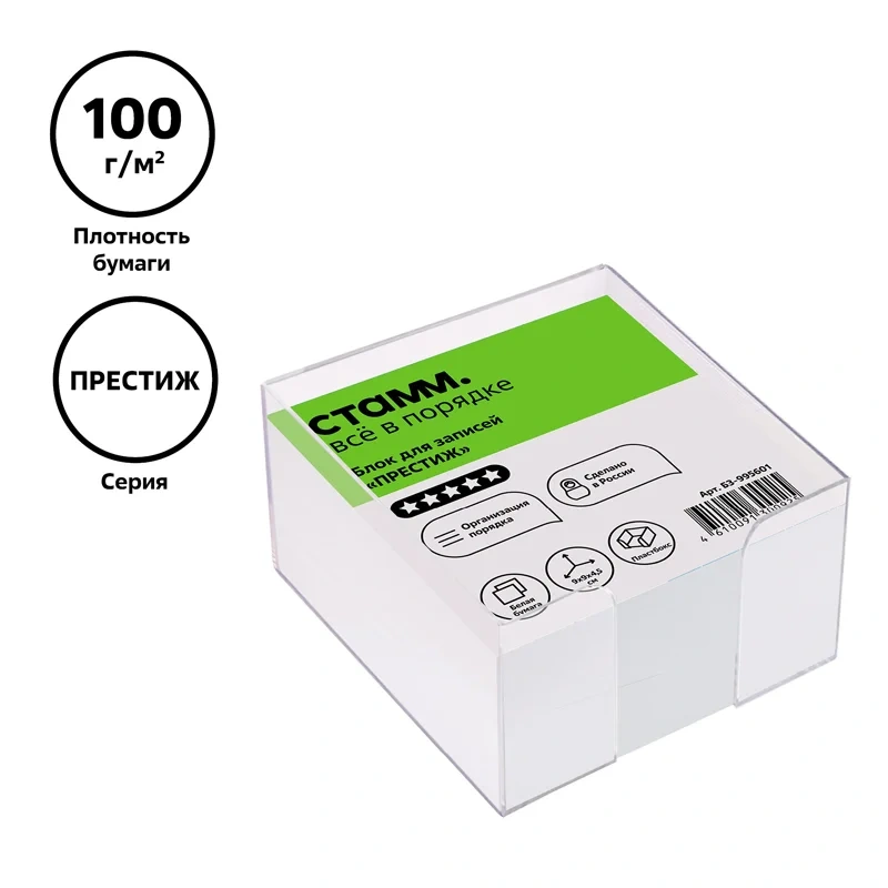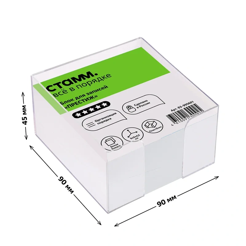Блок бумаги «СТАММ» Престиж в прозрачном пластиковом боксе подходит для оперативных записей необходимой информации. Размер листа в блоке: 90*90 мм, высота блока – 45 мм. Цвет бумаги блока - белый со стандартом белизны 100%. Блок для записей представлен в индивидуальной упаковке в термоусадочной плёнке.