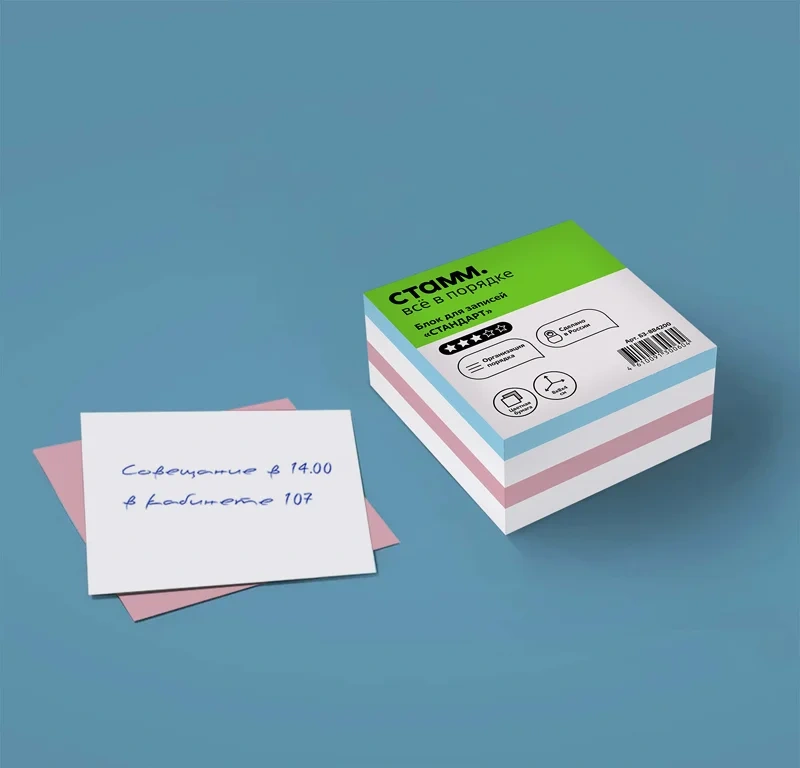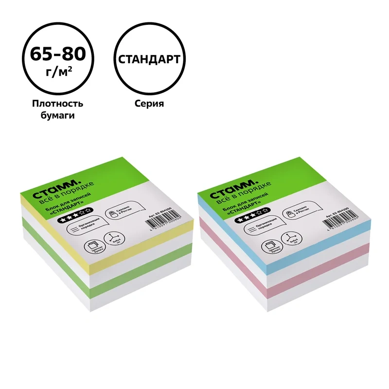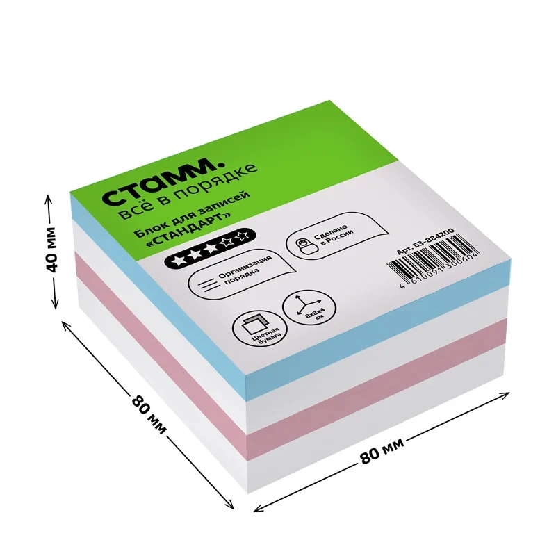 Блок бумаги «СТАММ» Стандарт подходит для оперативных записей необходимой информации. Размер листа в блоке: 80*80 мм, высота блока – 40 мм. Может использоваться в пластиковых подставках и настольных органайзерах. Блок для записей представлен в индивидуальной упаковке в термоусадочной плёнке.