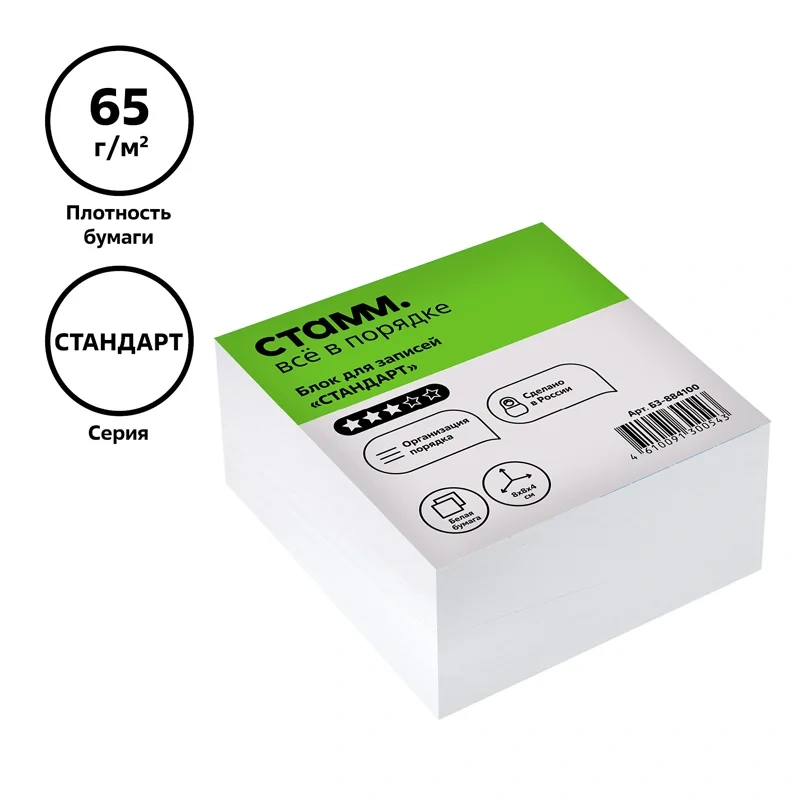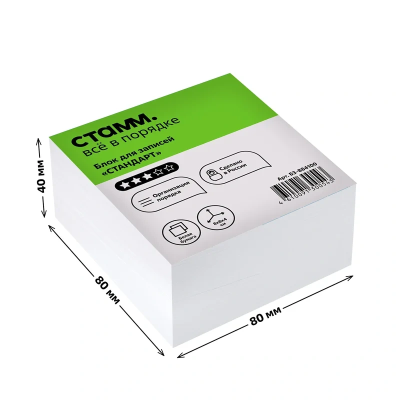 Блок бумаги «СТАММ» Стандарт подходит для оперативных записей необходимой информации. Размер листа в блоке: 80*80 мм, высота блока – 40 мм. Цвет бумаги блока - белый со стандартом белизны 90-92%. Может использоваться в пластиковых подставках и настольных органайзерах. Блок для записей представлен в индивидуальной упаковке в термоусадочной плёнке.