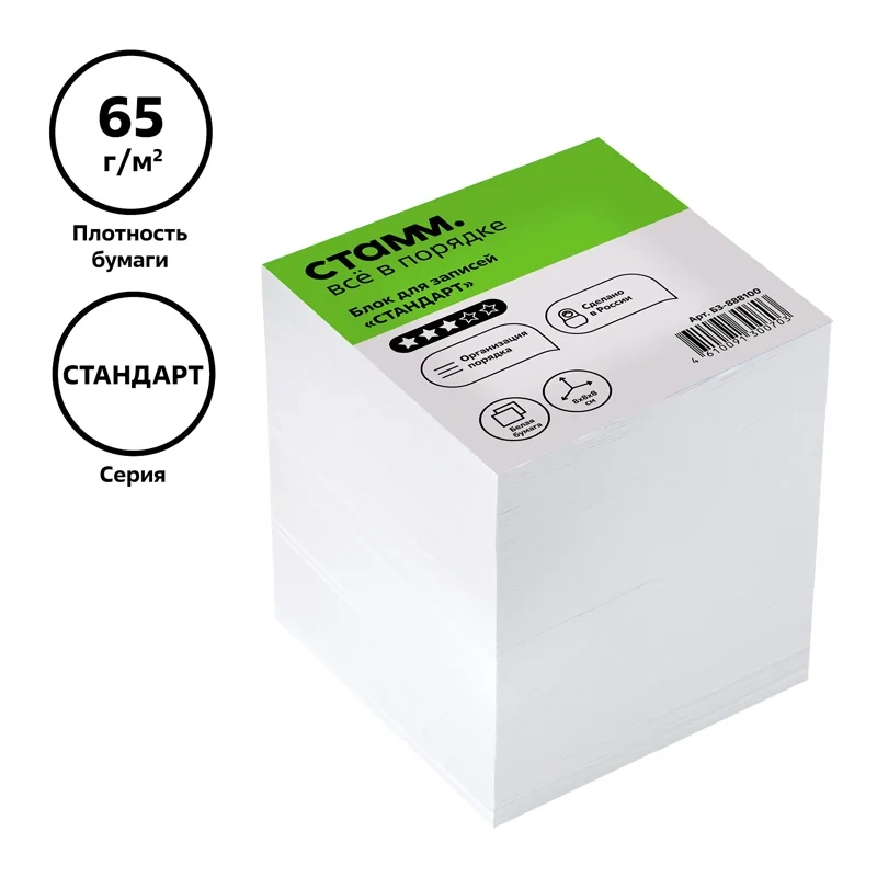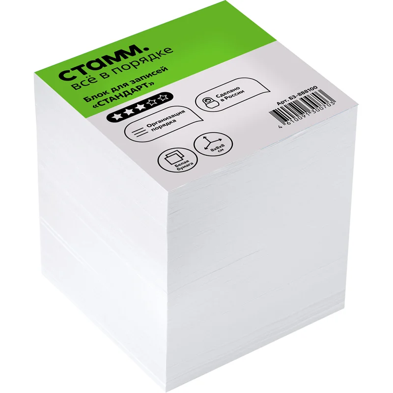 Блок бумаги «СТАММ» Стандарт подходит для оперативных записей необходимой информации. Размер листа в блоке: 80*80 мм, высота блока – 80 мм. Цвет бумаги блока - белый со стандартом белизны 90-92%. Может использоваться в пластиковых подставках и настольных органайзерах. Блок для записей представлен в индивидуальной упаковке в термоусадочной плёнке.