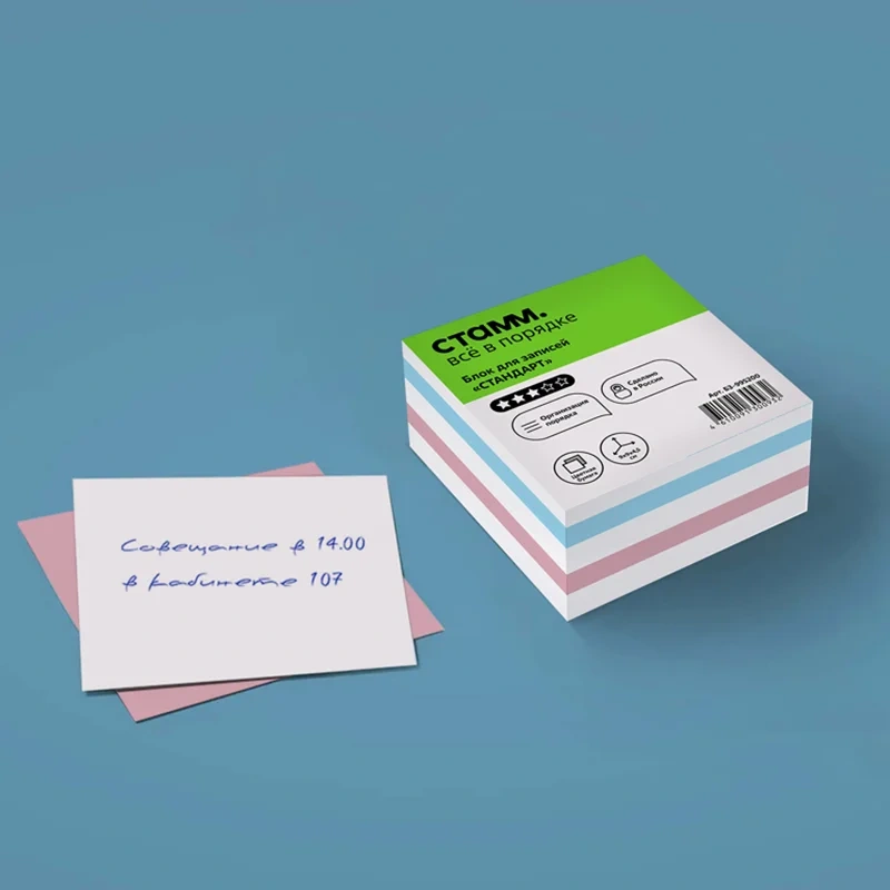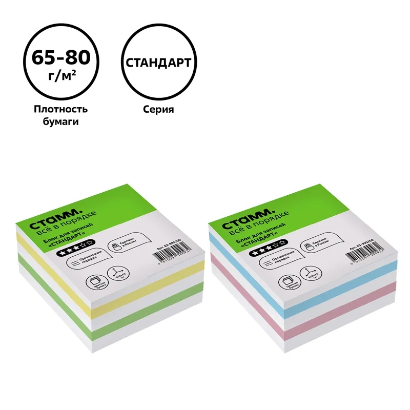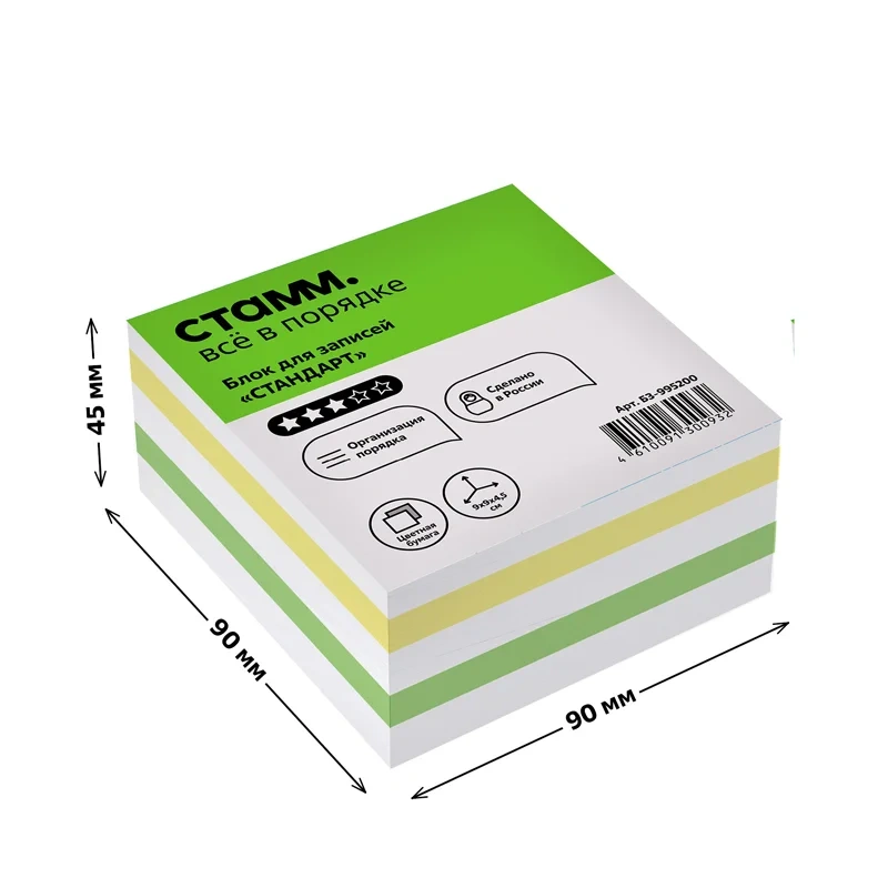Блок бумаги «СТАММ» Стандарт подходит для оперативных записей необходимой информации. Размер листа в блоке: 90*90 мм, высота блока – 45 мм. Может использоваться в пластиковых подставках и настольных органайзерах. Блок для записей представлен в индивидуальной упаковке в термоусадочной плёнке.