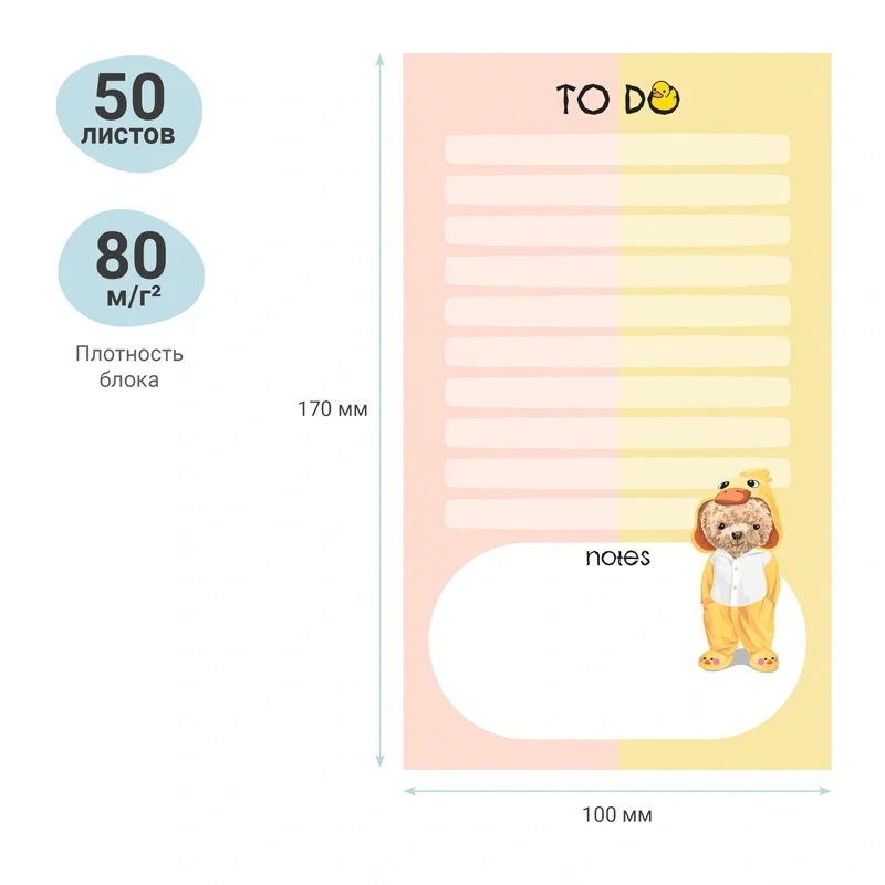 Рабочий стол и личное пространство заиграют новыми красками благодаря оригинальному дизайну листов бумаги для заметок с забавным и милым щенком. Склейка поможет аккуратно отрывать листы, не повреждая их. Блок для записей представлен в индивидуальной упаковке.