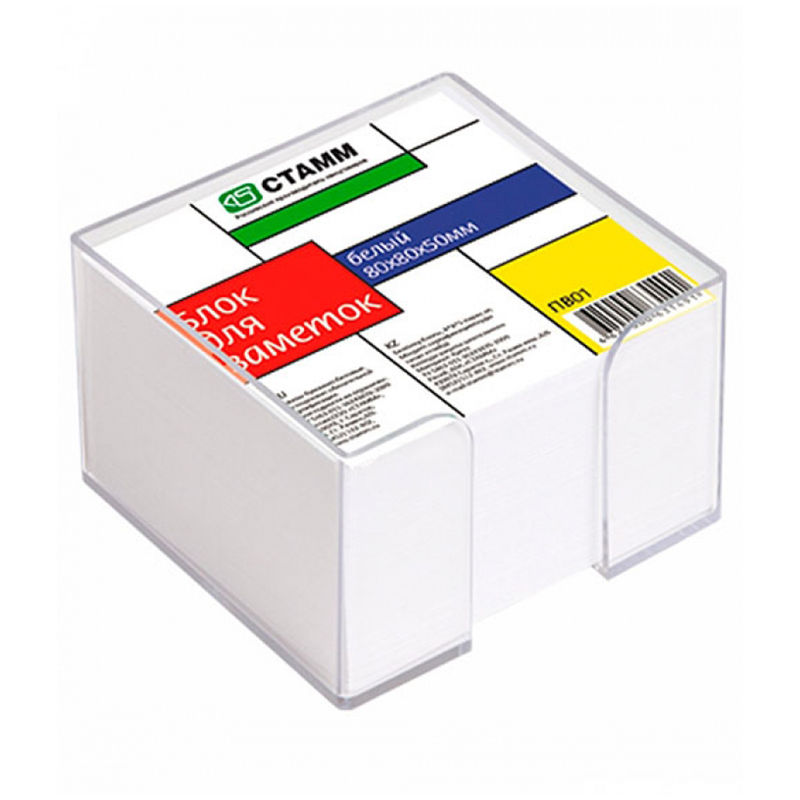 Блок для записи 8х8х5см, в пластбоксе. Прозрачный пластбокс, в который вложен блок, обеспечивает удобство использования и порядок на рабочем столе. Бумага белая, плотностью 80гр/м.кв. Упакован в термоусадочную пленку с цветным вкладышем.
