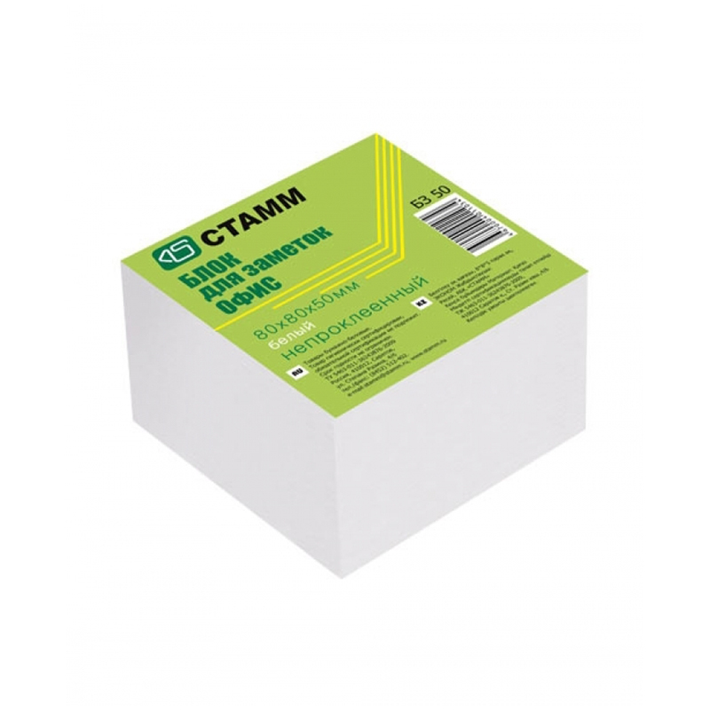 Блок для записи 8х8х5см, непроклеенный. Бумага белая плотностью 65гр/м.кв. Упакован в термоусадочную пленку с цветным вкладышем.