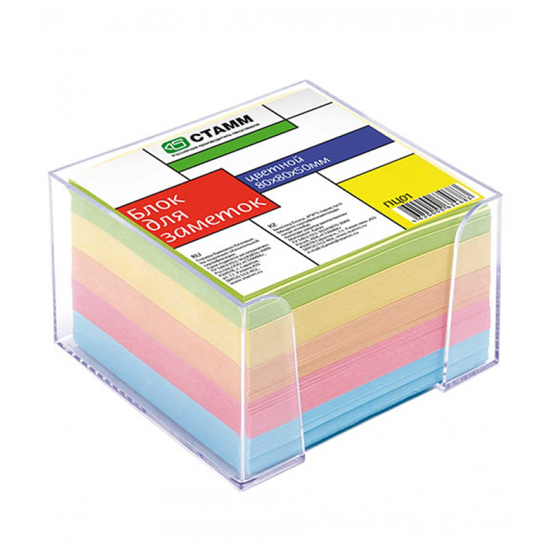 Блок для записи 8х8х5см, непроклеенный. Бумага 5-ти пастельных цветов, плотность 80гр/м.кв. Прозрачный пластбокс, в который вложен блок, обеспечивает удобство использования и порядок на рабочем столе. Упакован в термоусадочную пленку с цветным вкладышем.