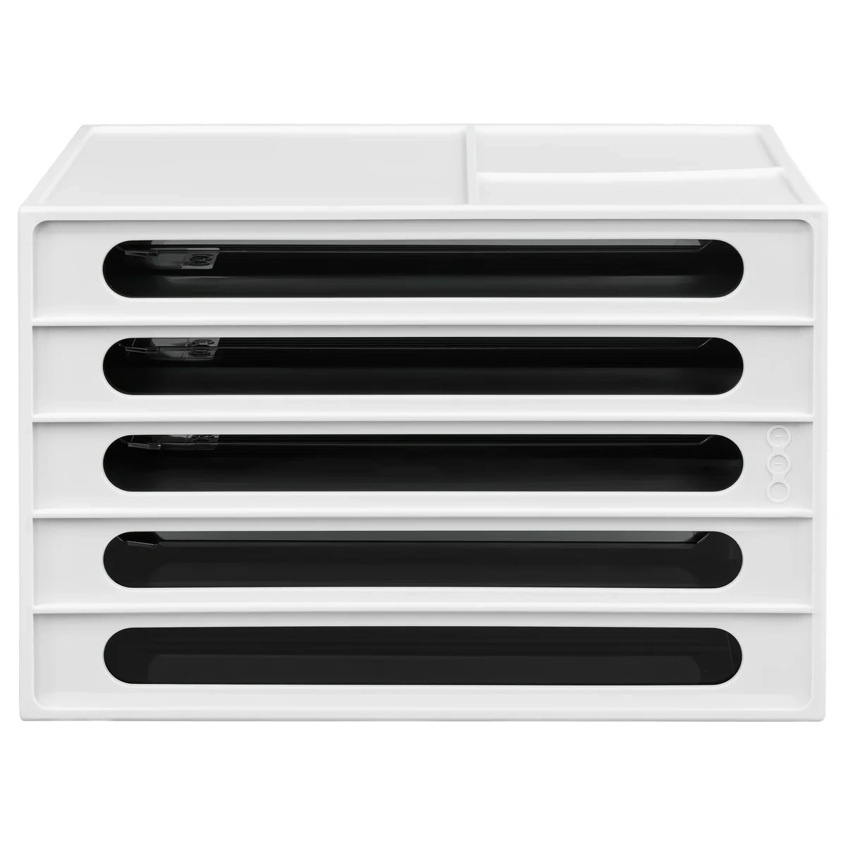 Блок из 4-х выдвижных лотков «СТАММ» предназначен для хранения бумаг формата А4 и канцелярских принадлежностей. Габариты горизонтального блока — 230*340*250 мм. На лотках есть ограничитель, препятствующий выпадению из корпуса. Предусмотрены окна для маркировок, облегчающие сортировку.