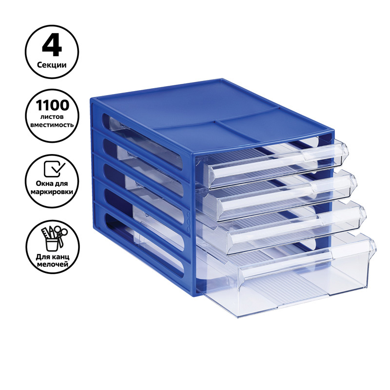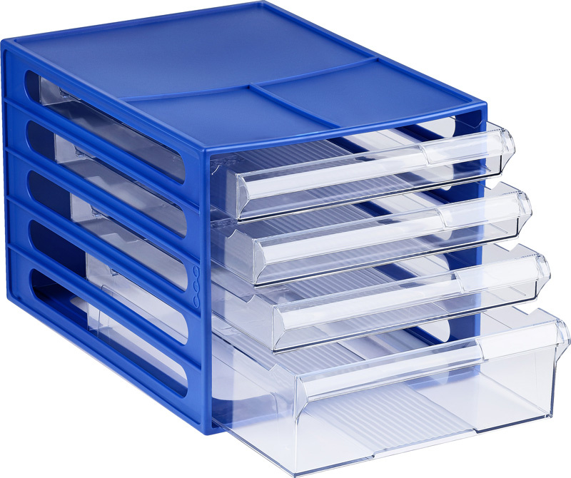 Блок из 4 выдвижных лотков Стамм, синий корпус, прозрачные лотки