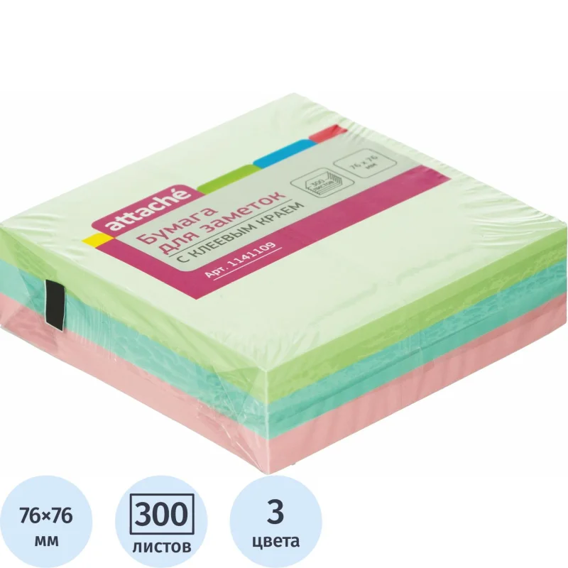 Стикеры Attache в формате 76×76 мм, состоят из 300 листов упакованных в пленку. Стикеры из 3 пастельных цветов. Плотность бумаги: 62 г/кв.м. Клейкий слой — 18 2 Н/м . Идеально подойдут для сотрудников творческих профессий и руководителей: рекомендуются для использования в процессе совещаний, обучения, мозговых штурмов. Длина клейкой стороны 76 мм.