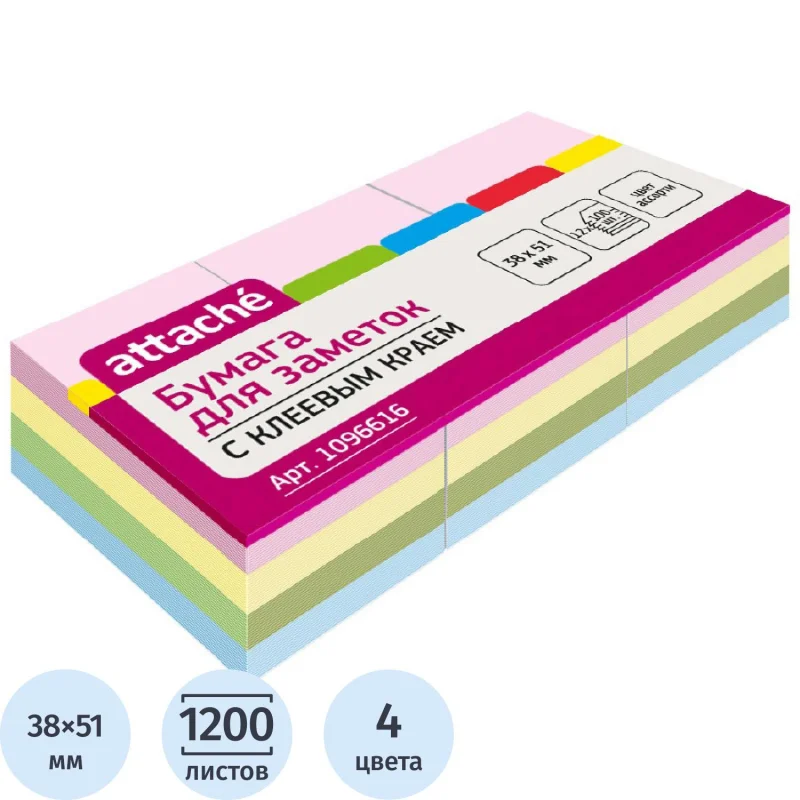Стикеры Attache в формате 38x51 мм, в упаковке 12 блоков по 100 листов (всего 1200 листов). Идеально подойдут для сотрудников творческих профессий и руководителей: рекомендуется для использования в процессе совещаний, обучения, мозговых штурмов. Плотность бумаги составляет 60 г/кв.м, клейкий слой - 22 Н/м. После удаления бумаги на поверхности не остается следов клеевого состава, лист можно крепить повторно. Длина клейкой стороны 38 мм. Комплект из 4 пастельных цветов (желтый, салатовый, голубой, светло-розовый). Чтобы увеличить срок службы стикеров, пожалуйста, следуйте рекомендациям: 1) Отделять стикер от блока следует вдоль клеевой полосы. Так можно избежать скручивания и последующего отклеивания стикера. 2) Прежде чем наклеивать стикер, убедитесь в отсутствии грязи и пыли на поверхности. На чистой поверхности срок службы клеевого слоя более продолжителен. Законодательные и технические документы: