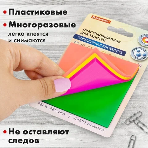 Блок пластиковых полупрозрачных стикеров четырех цветов в форме квадрата размером 76х76 мм состоит из 100 листов, по 25 листов каждого цвета. Листы легко клеятся к любой поверхности. Возможно многоразовое использование. Не оставляют следов, водостойкие. Сохраняют свои клейкие качества в независимости от способа отделения от блока.