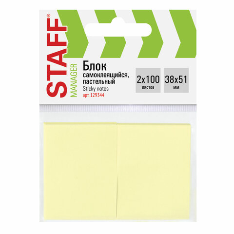 Блок самоклеящийся STAFF, 38х51 мм, 2х100 листов, желтый, 129344