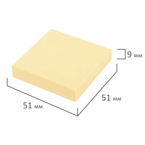 Стикеры жёлтого пастельного цвета в форме квадрата 51х51 мм состоят из 100 листов. Плотность бумаги составляет 65 г/м2. Клейкий слой - 18 Н/м. Легко клеятся к любой поверхности. Не оставляют следов. Упакованы в полиэтиленовую пленку.