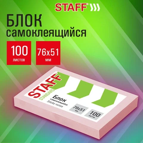 Блок самоклеящийся (стикеры) STAFF STANDARD, ПАСТЕЛЬНЫЙ 76х51 мм, розовый, 100 листов, 116584