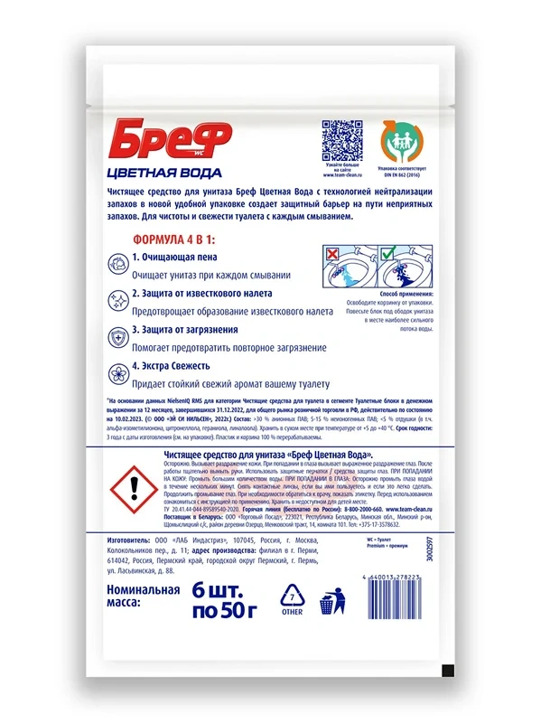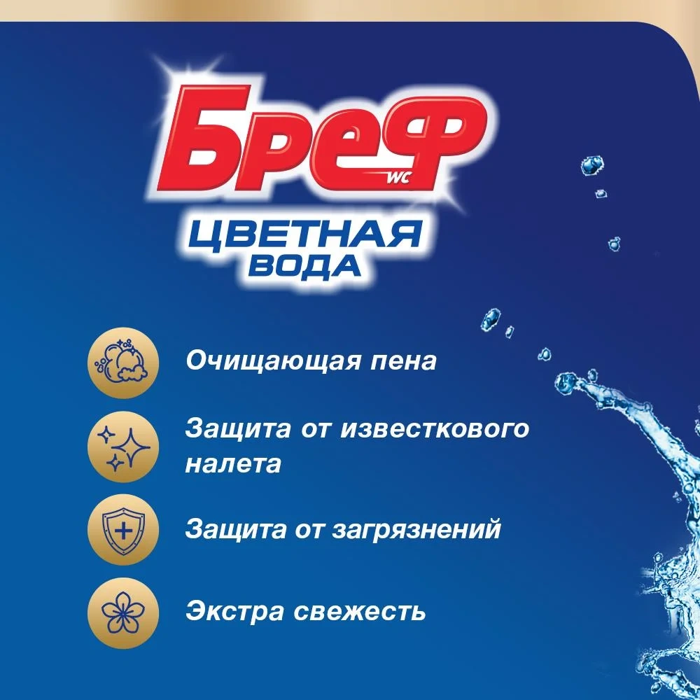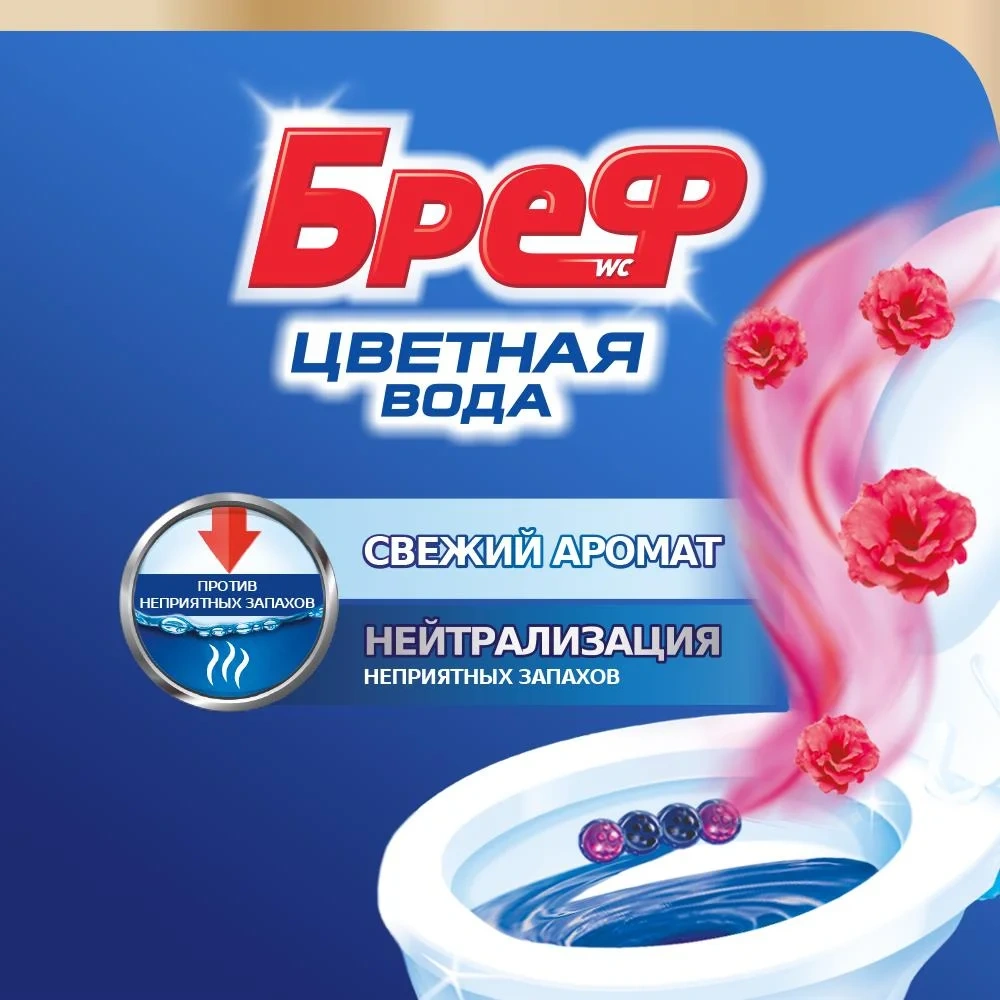 Бреф Цветная Вода - подвесной туалетный блок с технологией нейтрализации запахов, которая создает защитный барьер на пути неприятных запахов. Современная формула шариков для унитаза Бреф Цветная Вода. Подвесной туалетный блок с технологией нейтрализации запахов в новой удобной упаковке, который создает защитный барьер на пути неприятных запахов. Активная формула цветной воды действует в 4 направлениях: образует очищающую пену, которая обеспечивает гигиеническую чистоту, предотвращает образование известкового налета, помогает предотвратить повторное загрязнение, придает туалетной комнате свежий цветочный аромат.