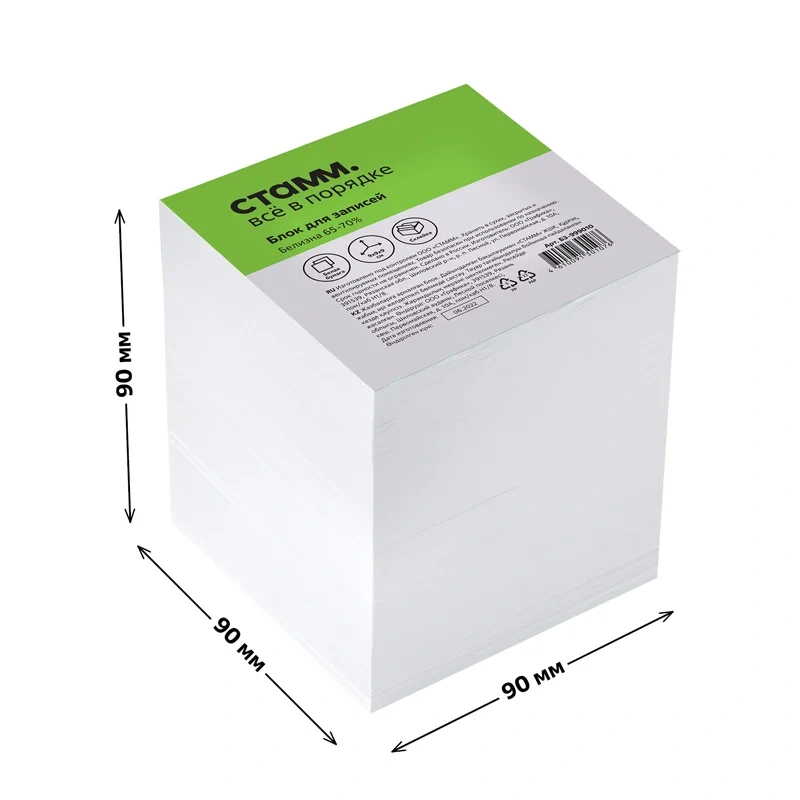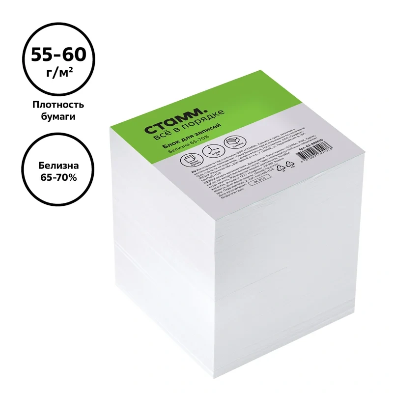 Блок для записи Стамм, 9*9*9см, пластиковый бокс, белый, белизна 65-70%