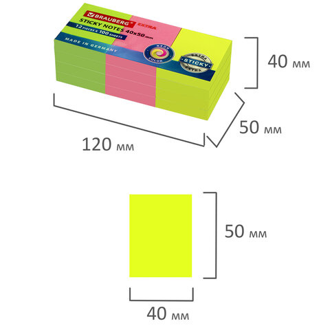 Блоки самоклеящиеся EXTRA STICKY BRAUBERG (Германия), НЕОНОВЫЕ, 40х50 мм, НАБОР 12 шт. по 100 л., 3