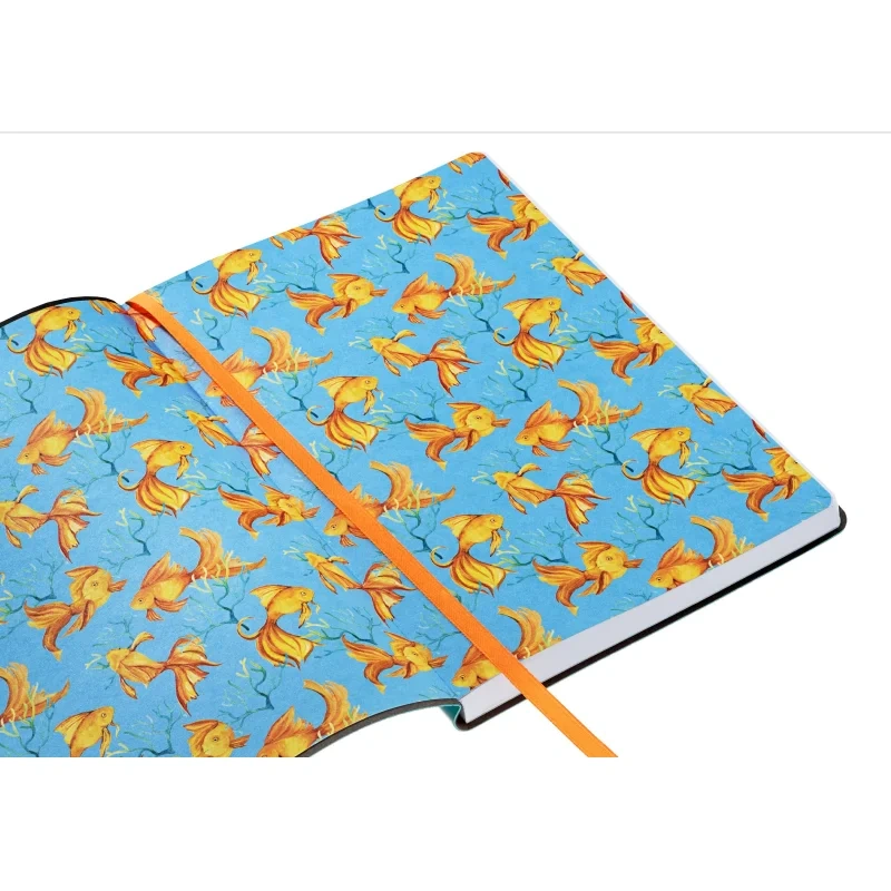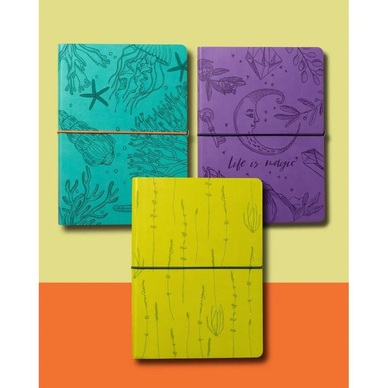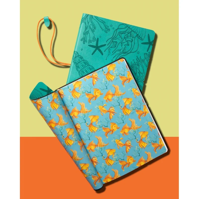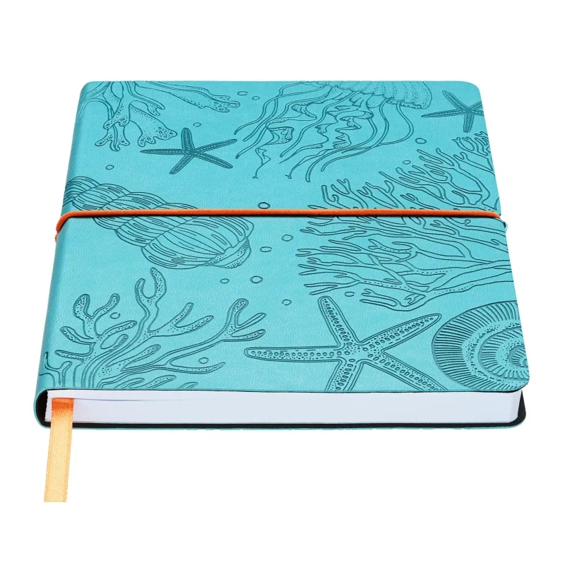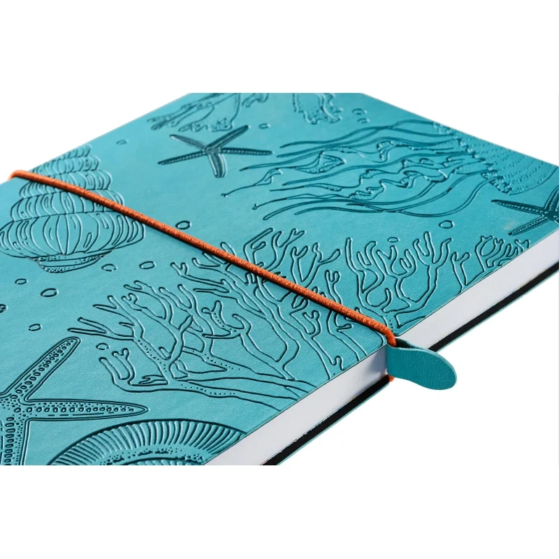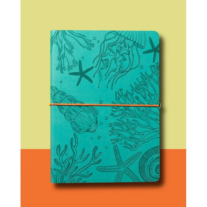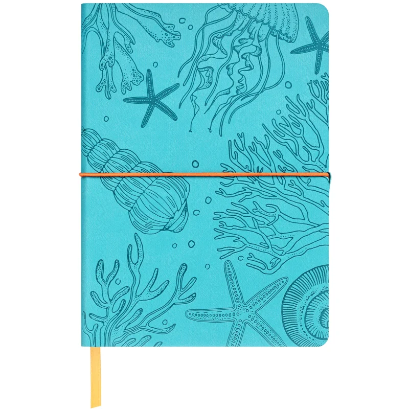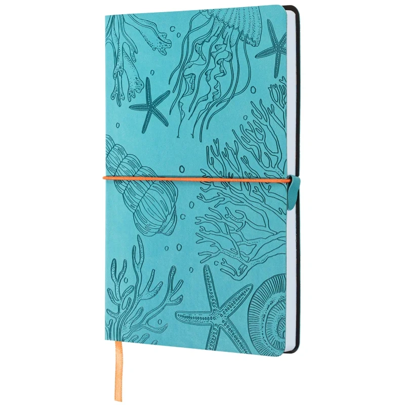 Блокнот Attache 'Морская' форматом А5 (150×210 мм) содержит 128 листов. Блок из офсетной бумаги 70 г/м2 разлинован в клетку. Форзац и нахзац блокнота с цветным печатным дизайнерским рисунком. Книжный переплет на сшивке. Гибкая мягкая обложка из экокожи бирюзового цвета с блинтовым тиснением по всему полю. Обложка с круглеными углами перетянута круглой поперечной закрывающей резинкой оранжевого цвета с захватом из экокожи бирюзового цвета. В блокноте предусмотрено ляссе оранжевого цвета. Упакован в индивидуальный пакет.