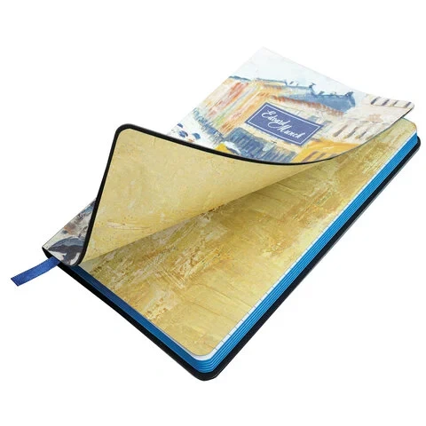 Внутренний блок включает 80 листов белой бумаги плотностью 70 г/м2. Благодаря стандартному формату А5 блокнот удобно использовать как в офисе, так и на выездных деловых встречах. Интегральная (мягкая) обложка с полноцветной печатью делает блокнот неповторимым и запоминающимся. Срез блокнота прокрашен, что придает ему особый шарм. Дополнением является закладка-ляссе, с помощью которой можно быстро открыть блокнот на нужной странице.