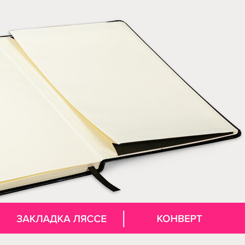 Твердая обложка стилизована под 'классическую кожу'. Имеет закругленные уголки, подходит для горячего тиснения и имеет резинку-фиксатор, благодаря чему не раскроется в сумке или портфеле и листы не помнутся. На внутренней стороне задней обложки есть декоративный конверт для разных мелочей в виде визиток, напоминалок или других милых и полезных мелочей. 100 листов позволят зафиксировать большой объем информации. Комбинированный блок (80 листов в клетку, 12 листов в линию + 8 перфорированных листов без линовки для заметок) дает возможность не только делать записи но и аккуратно заполнить цифровые значения, а также нанести чертежные и художественные зарисовки. Внутренний блок выполнен из офсета цвета слоновой кости плотностью 80 г/м2 и крепится к обложке с помощью книжного переплета. Дополнением является закладка-ляссе, с помощью которой при необходимости можно быстро открыть нужную страницу. Формат блокнота А5 (148х218 мм) позволит владельцу поместить его в кейс или сумку малых габаритов.