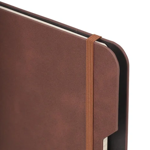 Твердая обложка стилизована под 'гладкую кожу'. Специальное покрытие с повышенными тактильными свойствами придает обложке мягкий, бархатистый эффект. Имеет закругленные уголки, подходит для горячего тиснения и имеет резинку-фиксатор, благодаря чему не раскроется в сумке или портфеле и листы не помнутся. 80 листов позволят зафиксировать большой объем информации. Линовка блока в клетку (5х5 мм) дает возможность аккуратно заполнить цифровые значения, а также нанести чертежные зарисовки. Внутренний блок выполнен из офсета цвета слоновой кости плотностью 70 г/м2 и крепится к обложке с помощью книжного переплета. Дополнением являются две закладки-ляссе, с помощью которой при необходимости можно быстро открыть или зафиксировать нужную страницу, а также держатель для ручки. Формат блокнота А5 (162х218 мм) позволит владельцу поместить его в кейс или сумку малых габаритов.