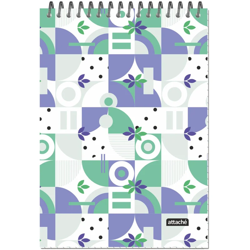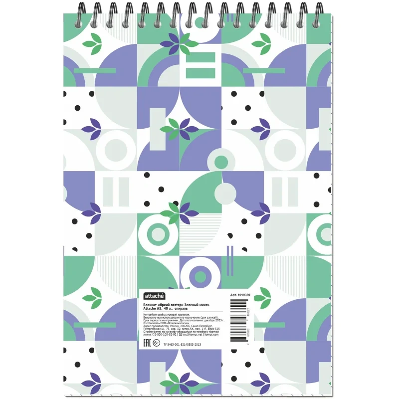 Блокнот Attache Яркий паттерн Зеленый микс — блокнот формата А5 для ведения записей. Состоит из мягкой картонной обложки в офисном стиле и 40 листов офсетной бумаги. Листовая бумага у данного блокнота имеет белый цвет. Она разлинована «в клетку». Плотность блока равна 40 граммам/квадратный метр. Листы надежно крепятся с обложкой с помощью гребня, крепление располагается сверху. Блокнот не имеет перфорации и разделителей, а также фиксирующей резинки, отверстия для прошивки и полей для подписи на обложке. Общий габариты блокнота составляют 146×204 миллиметров.