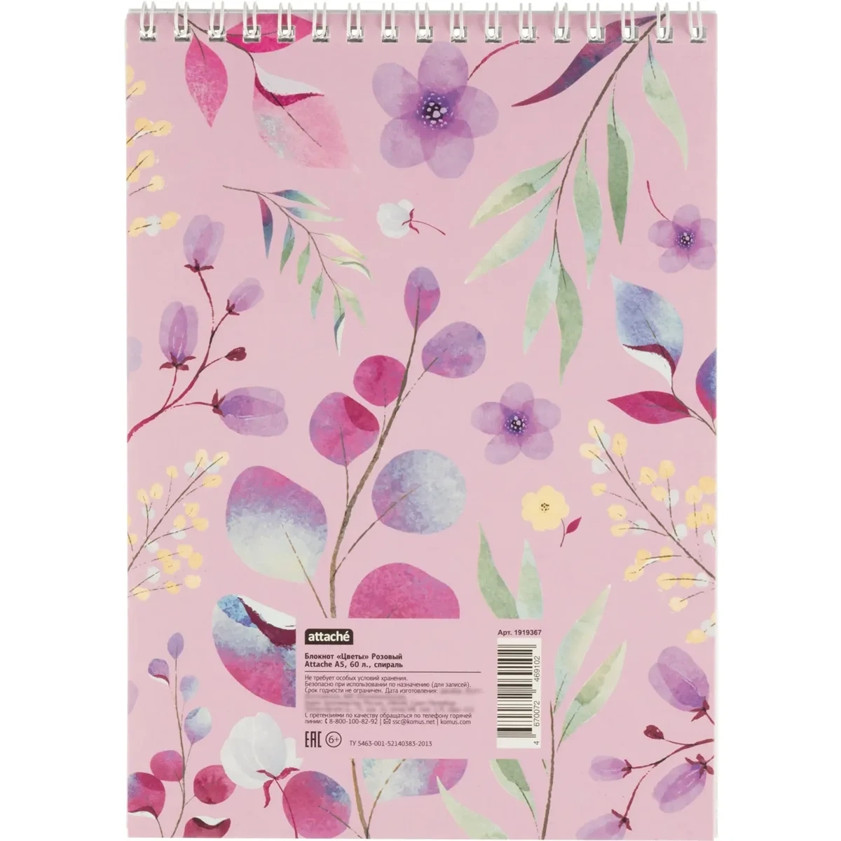 Блокнот Attache Цветы розовый, А5, 60 листов, в клетку, на спирали