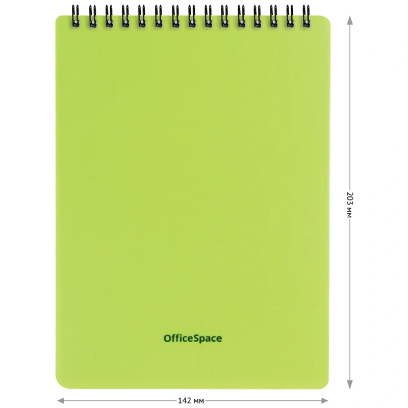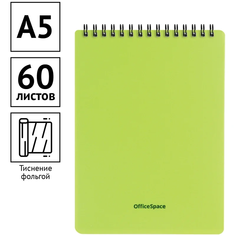 Блокнот на гребне OfficeSpace Neon формата А5 и размера 142*203 мм прекрасно подойдёт для работы и учёбы. Внутренний блок состоит из 60 листов офсетной бумаги в клетку и плотностью 60 г/м?. с печатью в 1 краску. Пластиковая обложка украшена тиснением фольгой и представлена в салатовом цвете.