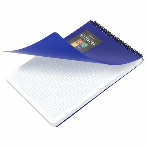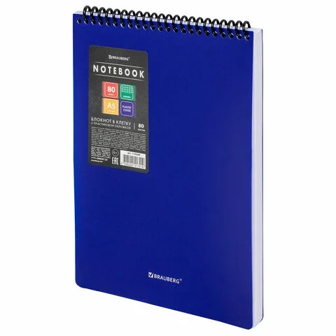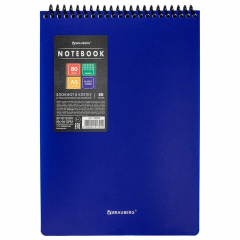 Блокнот формата А5 на спирали содержит 80 листов с линовкой в клетку, что позволяет зафиксировать большой объем нужной информации. Имеет верхнее расположение переплета. Обложка выполнена из пластика, что делает блокнот более износоустойчивым. Внутренний блок состоит из белой офсетной бумаги плотностью 70 г/м2.