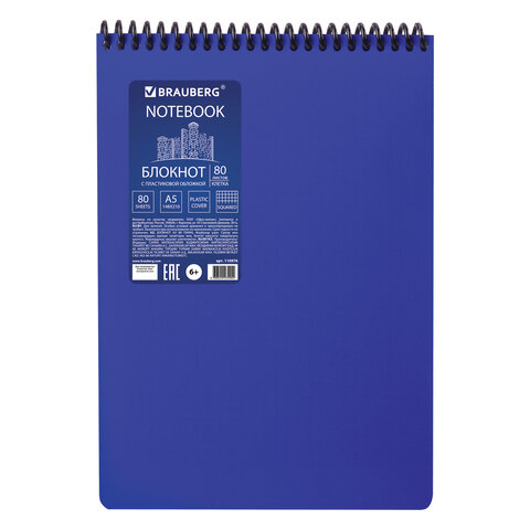Блокнот А5, 80 листов, спираль пластиковая, обложка пластик, клетка, BRAUBERG 'Metropolis', СИНИЙ, 1