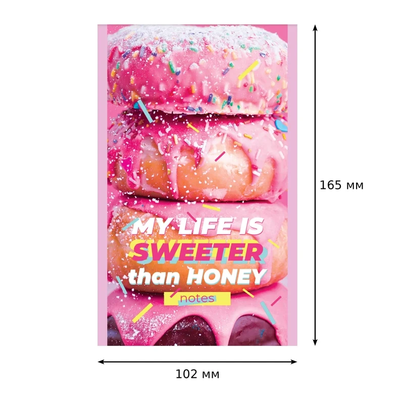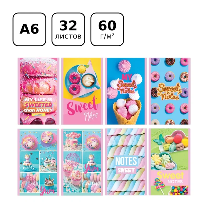 Блокнот BG «Сладкая сказка» формата А6 прекрасно подойдёт для работы и учёбы. Он состоит из 32 листов размером 102*165 мм офсетной бумаги белого цвета плотностью 60 г/м2. Линовка – клетка. Вид крепления – скрепка. Обложка – мелованный картон с блёстками. Милые «сладкие» дизайны на обложке блокнота поднимут настроение.