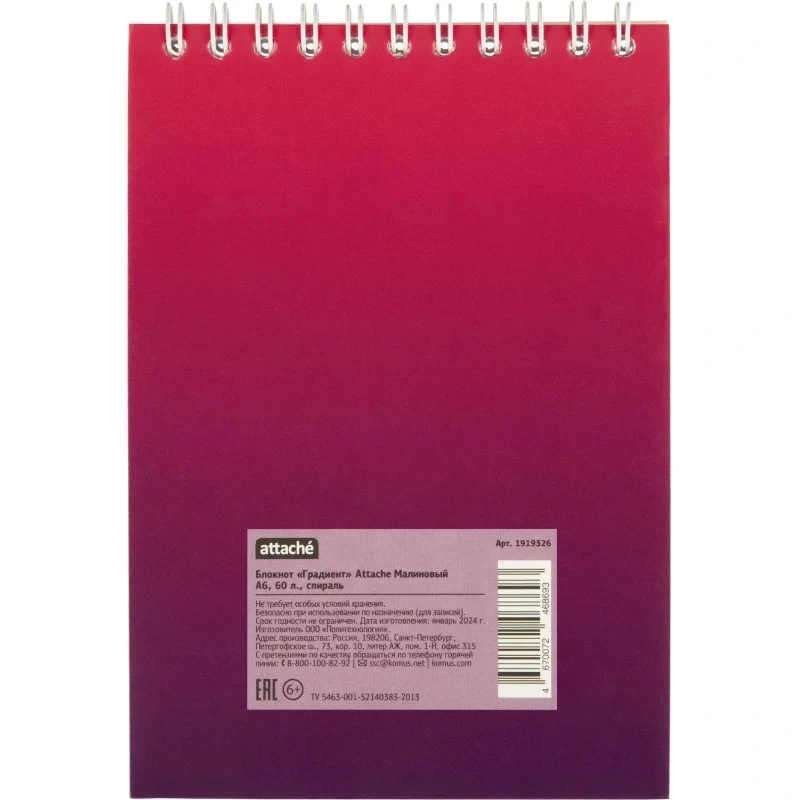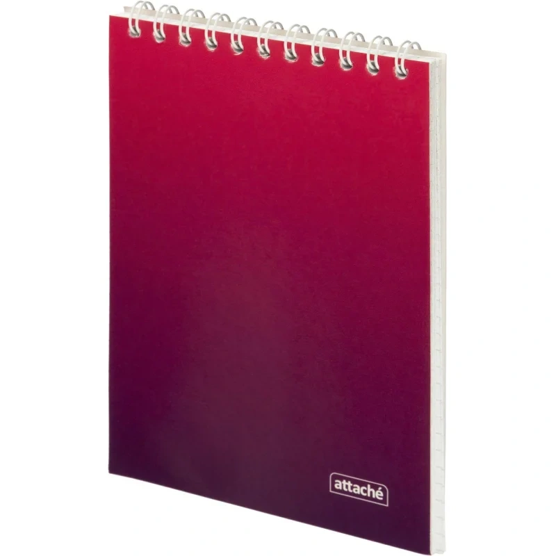 Блокнот А6 60л Attache Градиент Малиновый клетка, 65г, греб, УФ-лак Блокнот Attache Градиент изготовлен форматом А6 (146х102 мм). Обложка и подложка изготовлены из мелованного картона 190-210 г/м2. Блок-офсетная бумага 60г/м2, разлинованная в клетку. Количество листов в блоке-60. Блокнот скреплен металлическим гребнем (спиралью) по короткой стороне сверху. Применяется в школах, высших учебных заведениях и офисах.