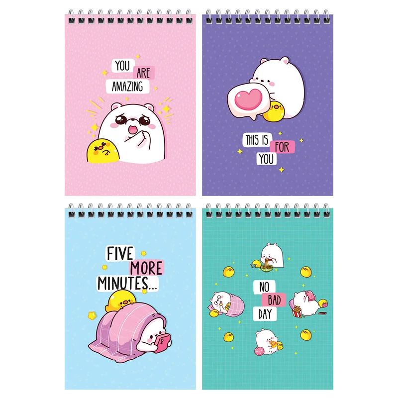 Внутренний блок состоит из 60 листов офсетной бумаги белого цвета плотностью 80 г/м2. Мягкая обложка сделана из плотного картона с матовой ламинацией и дополнена выборочным УФ-лаком. Блокнот с милым медвежонком представлен в четырёх вариантах дизайна.