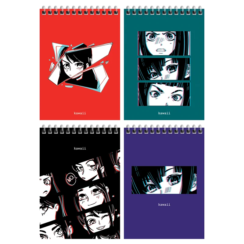 Внутренний блок состоит из 60 листов офсетной бумаги белого цвета плотностью 80 г/м2. Мягкая обложка сделана из плотного картона с матовой ламинацией и дополнена выборочным УФ-лаком. Блокнот в стиле аниме представлен в четырёх вариантах дизайна.