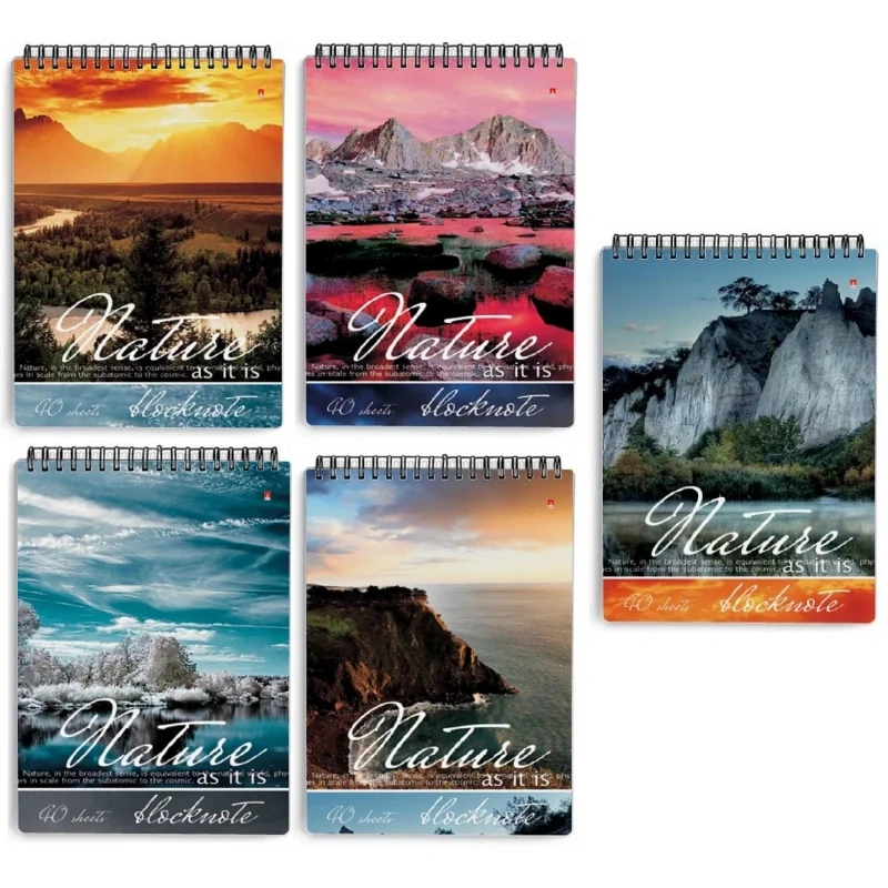 Блокноты серии «Природа» формата А5, размеры 127×200 мм. Обложка из картона плотностью 235 г/кв.м. Блокнот на металлическом гребне с вертикальным раскрыванием 40 листов, из белой бумаги в клетку, плотность 55 г/кв.м. Внимание! Товар поставляется в несколькиx вариантаx цвета/дизайна (без возможности выбора).