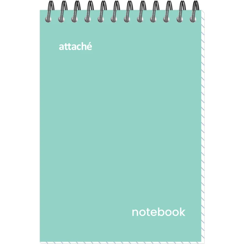 Блокнот Attache формата А6 на спирали. Предназначен для записей. Используется в старших классах, студентами и в офисе. Обложка изготовлена из мелованного картона с цветной печатью, плотность — 200 г/кв.м. Дизайн обложки однотонный, в стильных пастельных тонах (бирюзовый). Внутренний блок — не тонированная бумага, офсетная 60 г/кв.м, белизна — 100%. Блокнот толщиной 40 листов в клетку. Размер блокнота — 102×146 мм.