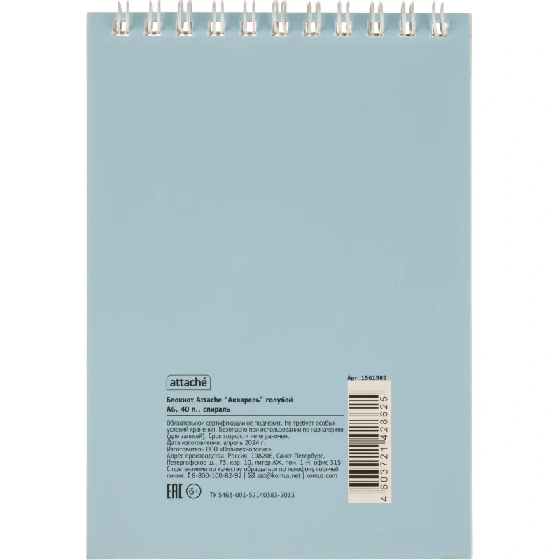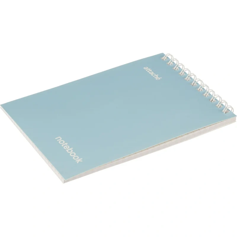 Блокнот Attache формата А6 на спирали. Предназначен для записей. Используется в старших классах, студентами и в офисе. Обложка изготовлена из мелованного картона с цветной печатью, плотность — 200 г/кв.м. Внутренний блок — не тонированная бумага, офсетная 60 г/кв.м, белизна — 100%. Дизайн обложки однотонный, в стильных пастельных тонах (голубой). Блокнот толщиной 40 листов в клетку. Размер блокнота — 102×146 мм.