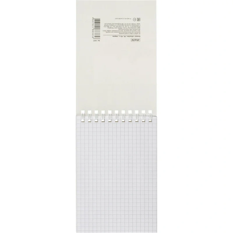 Блокнот Attache имеет стандартный формат А6. Блокнот в обложке, выполненной из мелованного картона, плотностью 200 г/кв.м. Внутренний блок состоит из 40 листов (80 страниц), разлинованных в клетку. Закреплен на металлической спирали. Плотность блока — 60 г/кв.м. Белая бумага с полями. Размер изделия: 105×145 мм.