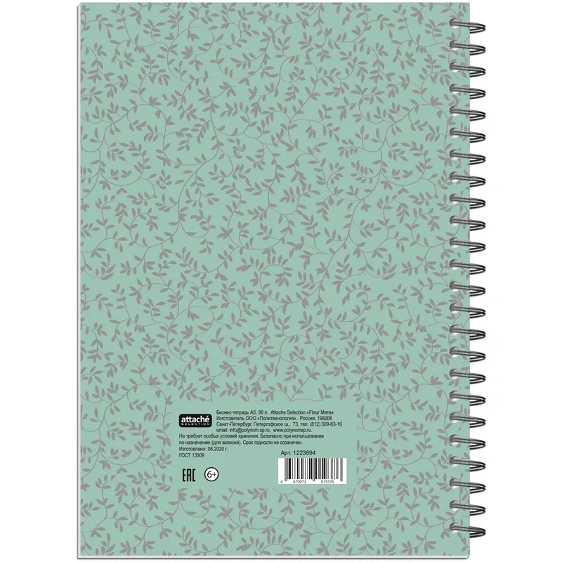 Бизнес-тетрадь Attache Fleur Мята формата А5 на спирали (металлическом гребне) предназначена для записей. Обложка изготовлена из картона с цветной печатью и матовой ламинацией, плотность 230 г/кв.м. Внутренний блок — белая бумага, офсетная 60 г/кв.м, белизна — 100%. Тетрадь состоит из 96 листов с линовкой «в точку». Размер тетради — 145?203 мм.