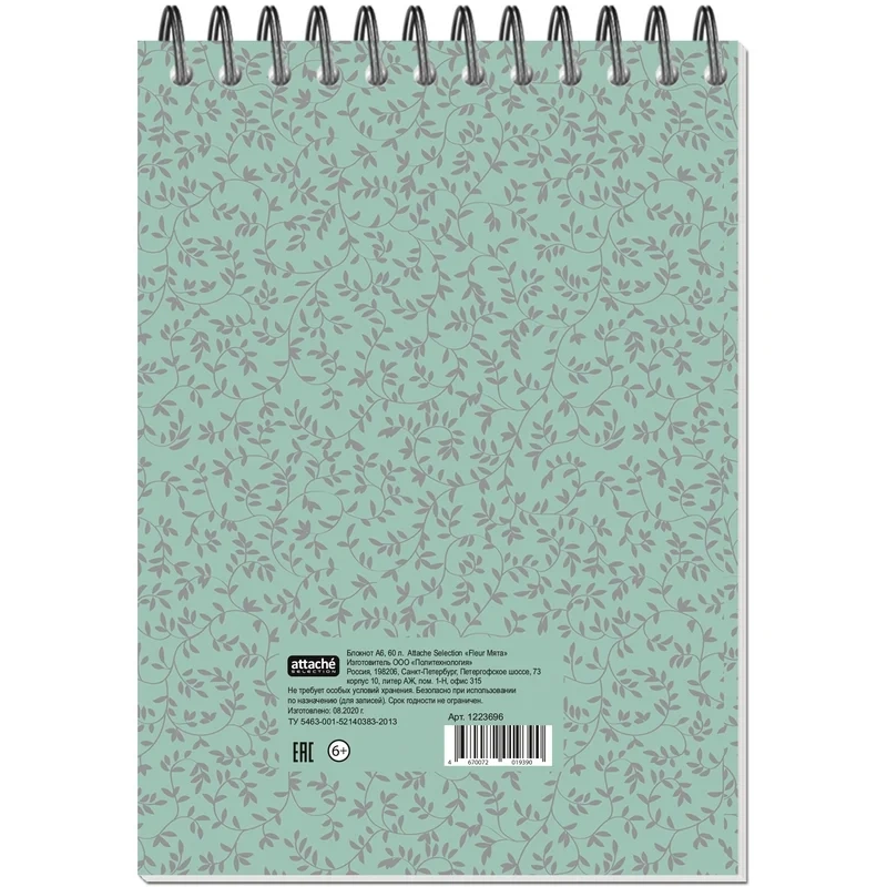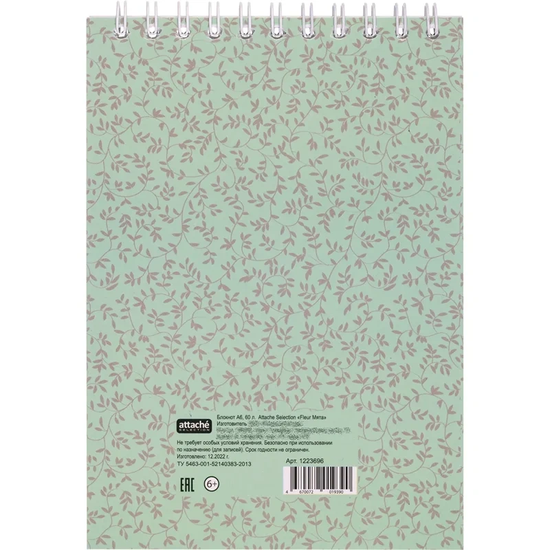 Блокнот Attache Fleur Мята формата А6 на спирали предназначен для записей. Обложка изготовлена из картона с цветной печатью и матовой ламинацией, плотность 230 г/кв.м. Внутренний блок — белая бумага, офсетная 60 г/кв.м, белизна — 100%. Блокнот состоит из 60 листов с линовкой «в точку». Размер блокнота — 101×145 мм.