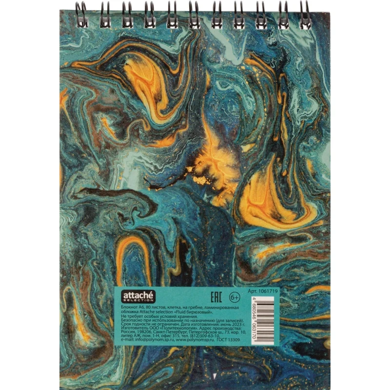 Блокнот Attache Selection Fluid формата А6 на спирали. Предназначен для записей. Используется в старших классах, студентами и в офисе. Обложка изготовлена из мелованного картона с цветной печатью и с глянцевым лакированием, плотность — 200 г/кв.м. Внутренний блок — нетонированная бумага, офсетная 60 г/кв.м, белизна — 100%. Блокнот толщиной 80 листов (160 страниц) в клетку. Размер блокнота — 101×145 мм.