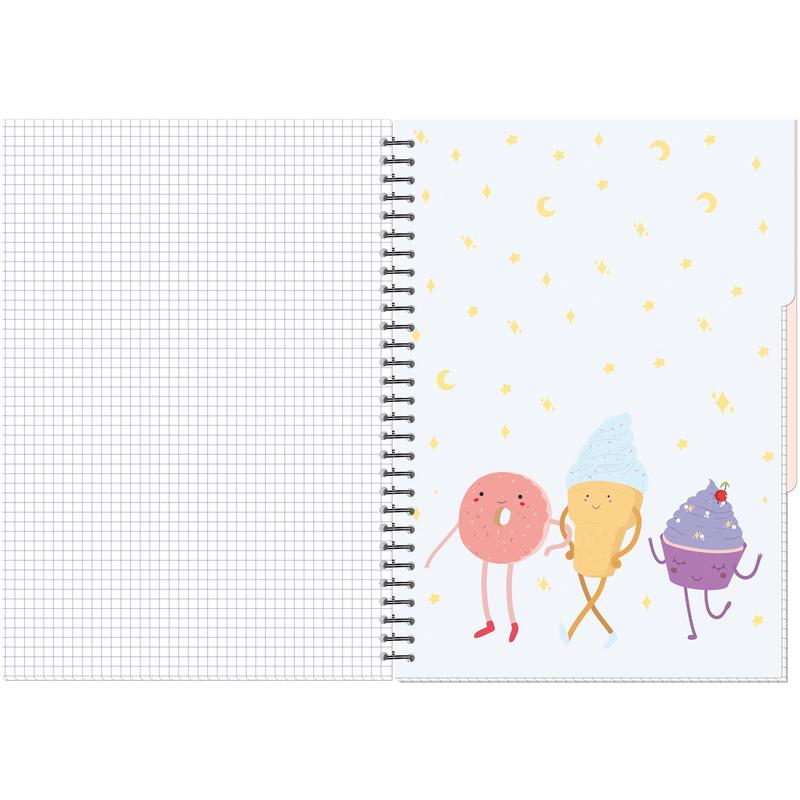 Тетрадь общая Attache Selection Sweet Life «Сладости» А4 на спирали (металлическом гребне) в двумя картонными разделителями — предназначена для записей, используется в старших классах, студентами и в офисе. Обложка изготовлена из картона с цветной печатью и матовой ламинацией, плотность 230 г/кв.м. Внутренний блок — белая бумага, офсетная 60 г/кв.м, белизна — 100%. Тетрадь толщиной 96 листов в клетку. Размер тетради — 213?293 мм. В тетради — два разделителя из картона 230 г/кв.м, с матовой ламинацией, делят тетрадь на три блока по 32 листа.