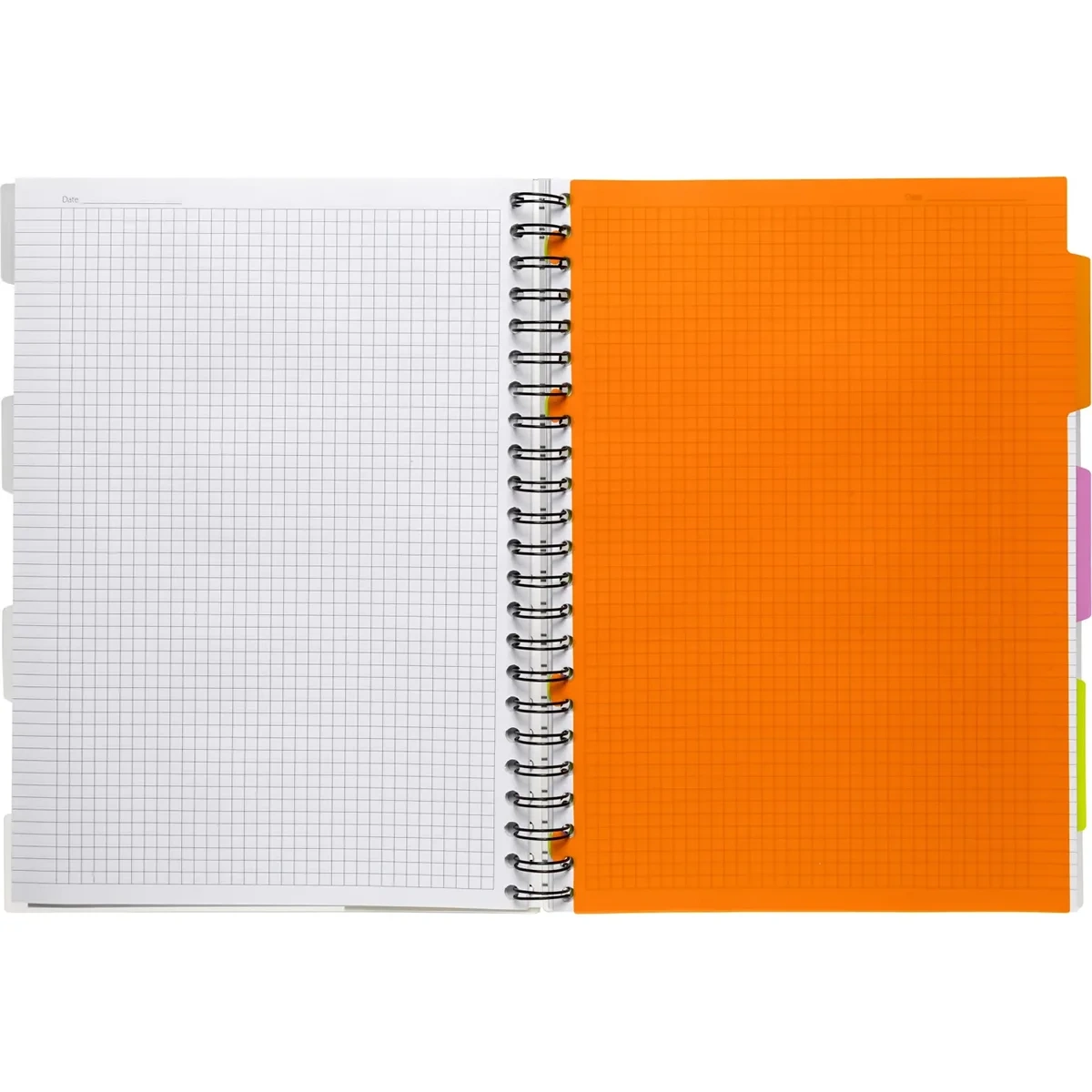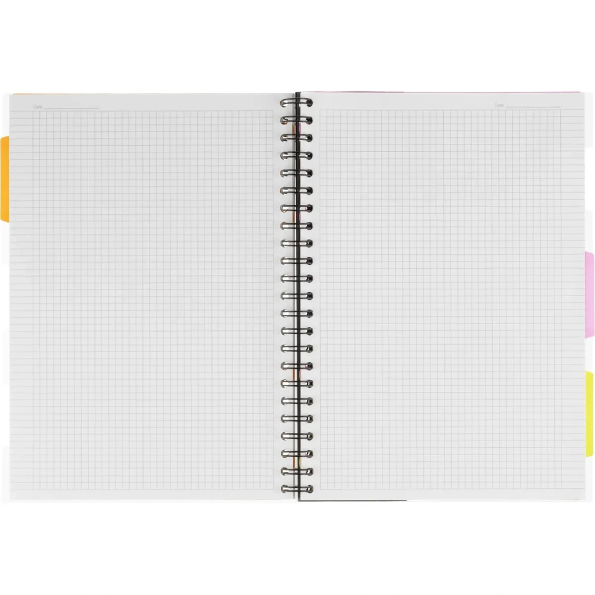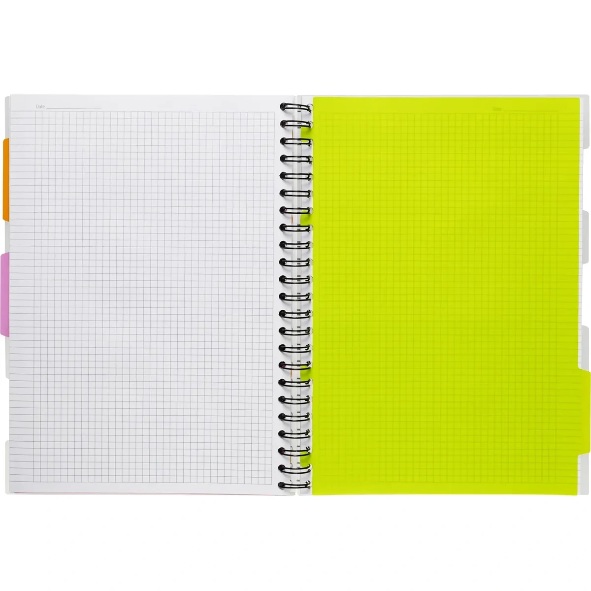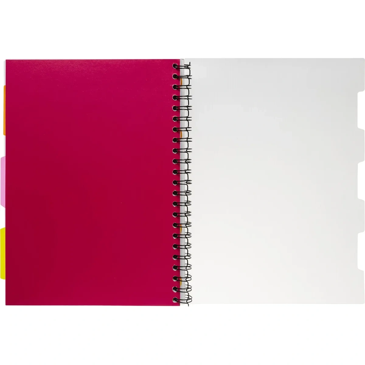Бизнес-тетрадь формата А4, размер бизнес-тетради — 230×298 мм. Обложка с вырубкой выполнена из жёсткого экологичного прозрачного пластика розового цвета с волнистым рельефом. Двойная толстая евроспираль увеличенного диаметра. Внутренний блок из белой офсетной бумаги плотностью 70 г/кв.м. Размер блока — 205×297 мм. Бизнес-тетрадь содержит пластиковые съёмные разделители. Первый лист из плотной бумаги с запечаткой, разлиновка в клетку с аккуратными полями.
