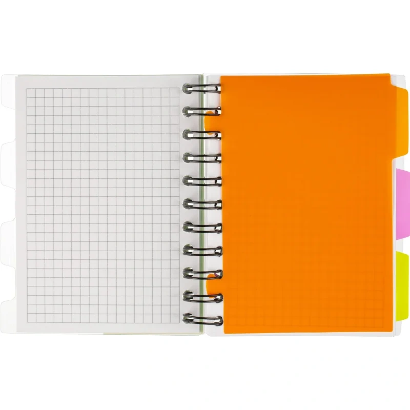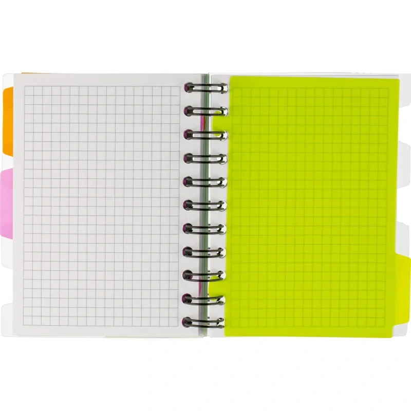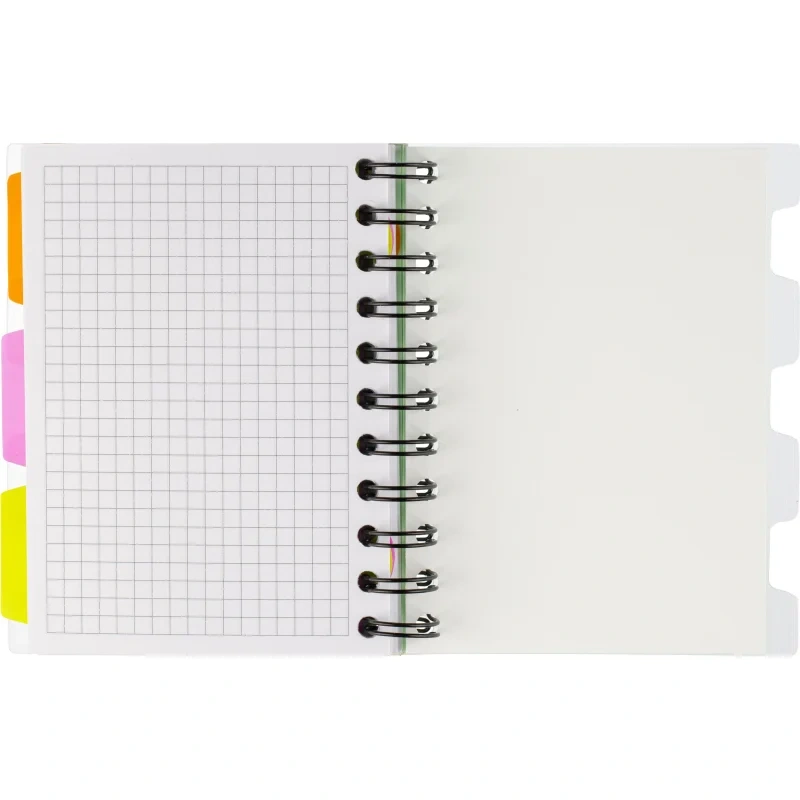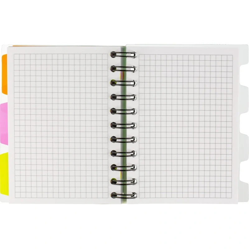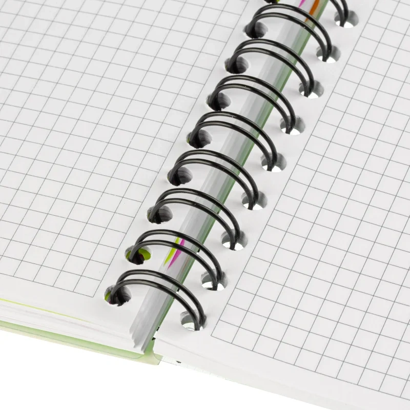 Внутренний блок включает 140 листов белой офсетной бумаги плотностью 60 г/кв. м. Бумага разлинована в клетку без полей и подходит для письма ручкой и карандашом. Цвет обреза — белый. Первый лист изготовлен из более плотной бумаги с запечаткой. Листы закреплены слева с помощью металлического гребня — двойной евроспирали увеличенного диаметра, которая обеспечивает надёжную фиксацию блока и удобное перелистывание страниц. Для навигации предусмотрены три съёмных пластиковых разделителя. Тетрадь произведена в России и поставляется по одной штуке.