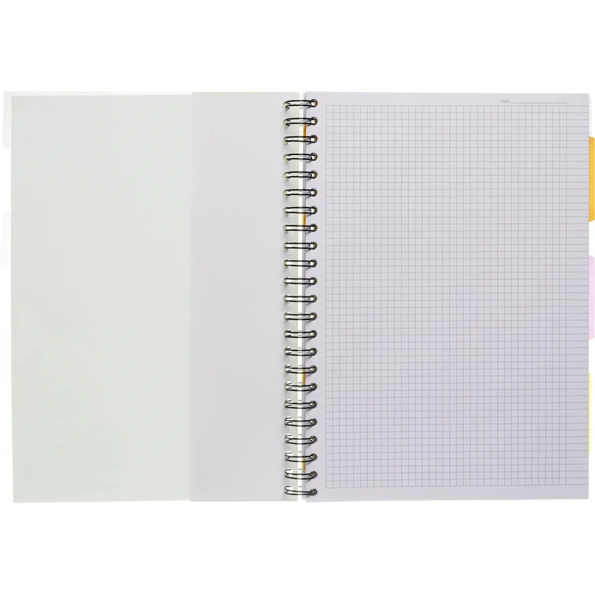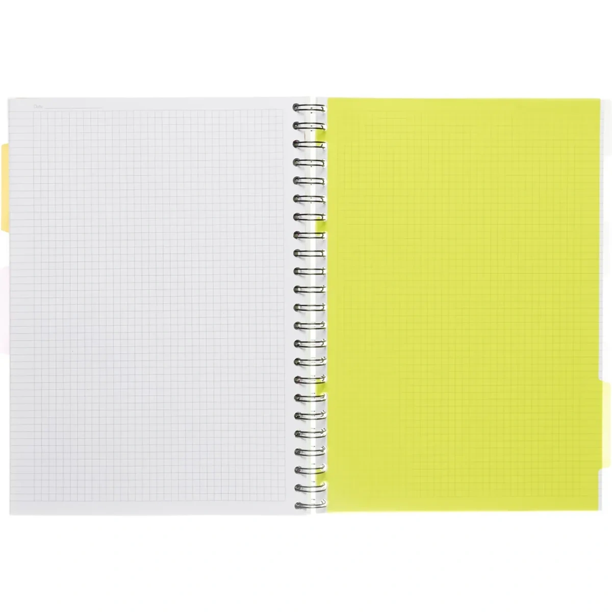 Бизнес-тетрадь формата А4, размер 230×298 мм. Обложка с вырубкой выполнена из жёсткого экологичного прозрачного пластика салатового цвета с волнистым рельефом. Двойная толстая евроспираль увеличенного диаметра. Внутренний блок из белой офсетной бумаги плотностью 70 г/кв.м. Размер блока — 205×297 мм. Бизнес-тетрадь содержит пластиковые съёмные разделители. Первый лист из плотной бумаги с запечаткой, разлиновка в клетку с аккуратными полями.